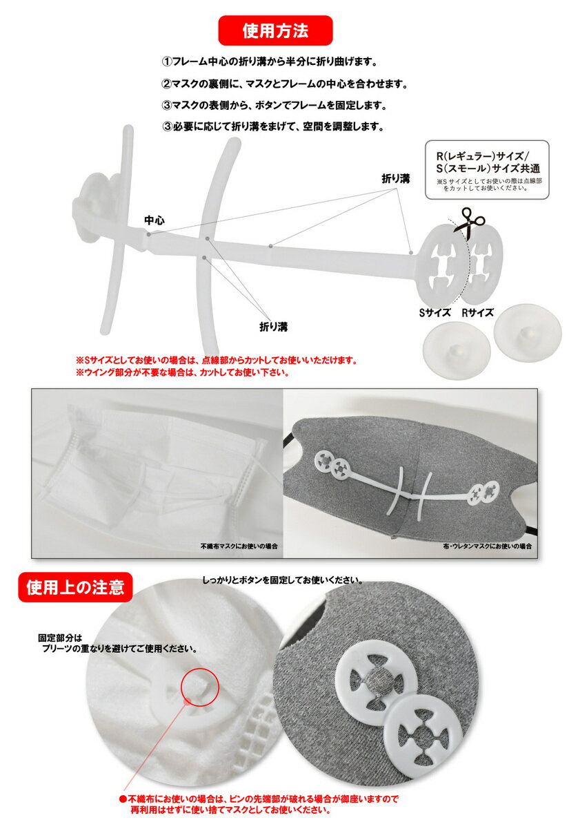※一部地域は土日を除く新設計 改良版 マスクインナー フレーム 不織布 ウレタン 布マスク 小さめ〜普通サイズ兼用 着せ替えボタン 肌荒れ防止 軽量 着せ替え 空間 マスクブラケット スペーサー マスクフレーム マスクサポーター 肌荒れ プラスチック マスク 息楽 肌荒れ軽減 肌トラブル 送料無料!新設計のH型ウィングが快適なマスク空間を作る! ボタンで固定する新発想のマスクインナーフレーム H型ウイングが快適なマスク空間を作る、新設計マスクフレーム マスク着用時の不快感や肌トラブルなどに着目した、バータイプのインナーフレーム「マスクぴたのんBIB-IT.+」に、H型ウイングが付いて新登場!!S/Rサイズ共通の新型フレーム。